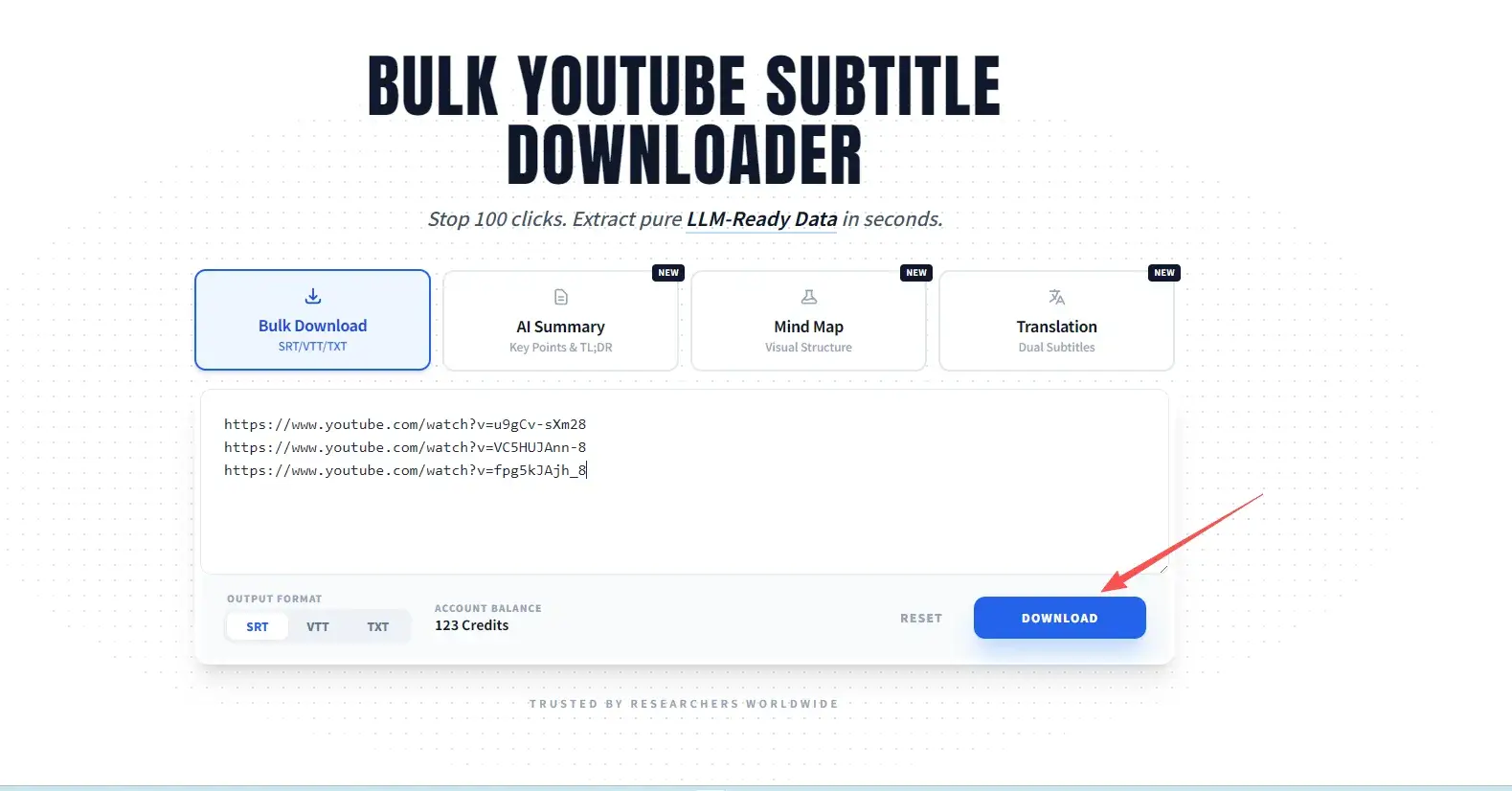 Are you looking for an efficient way to download YouTube subtitles for multiple videos? YTVidHub is designed to be the fastest youtube subtitle downloader on the market. Whether you need to extract closed captions (CC) for AI training, accessibility, or content repurposing, our batch processing engine ensures you get the highest quality transcripts without the manual hassle.
